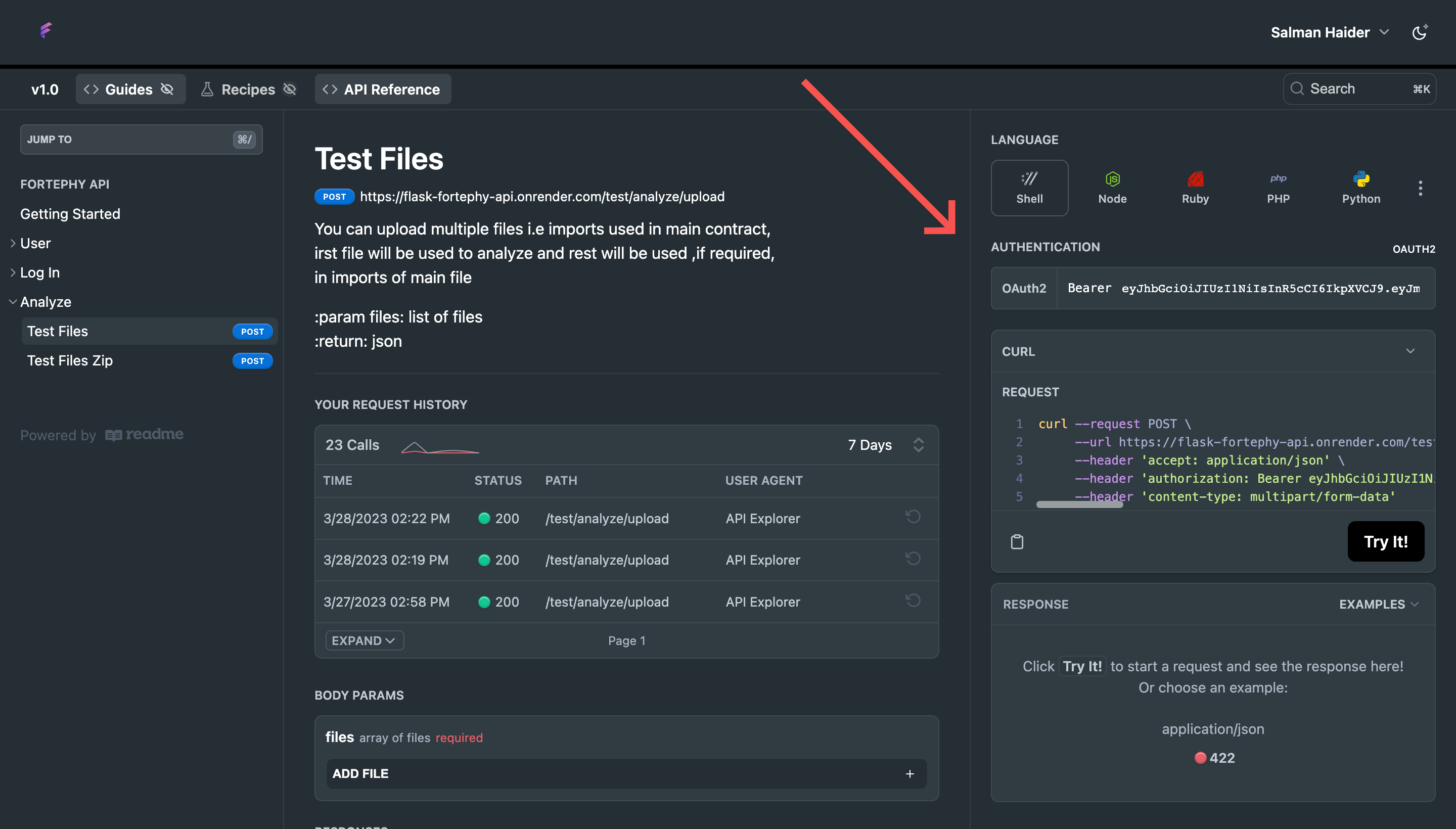 - For the "Test Files" endpoint, Paste the access token after "Bearer". Add relevant smart contract files (starting with the main/target contract for analysis) and add jq at the end of the command