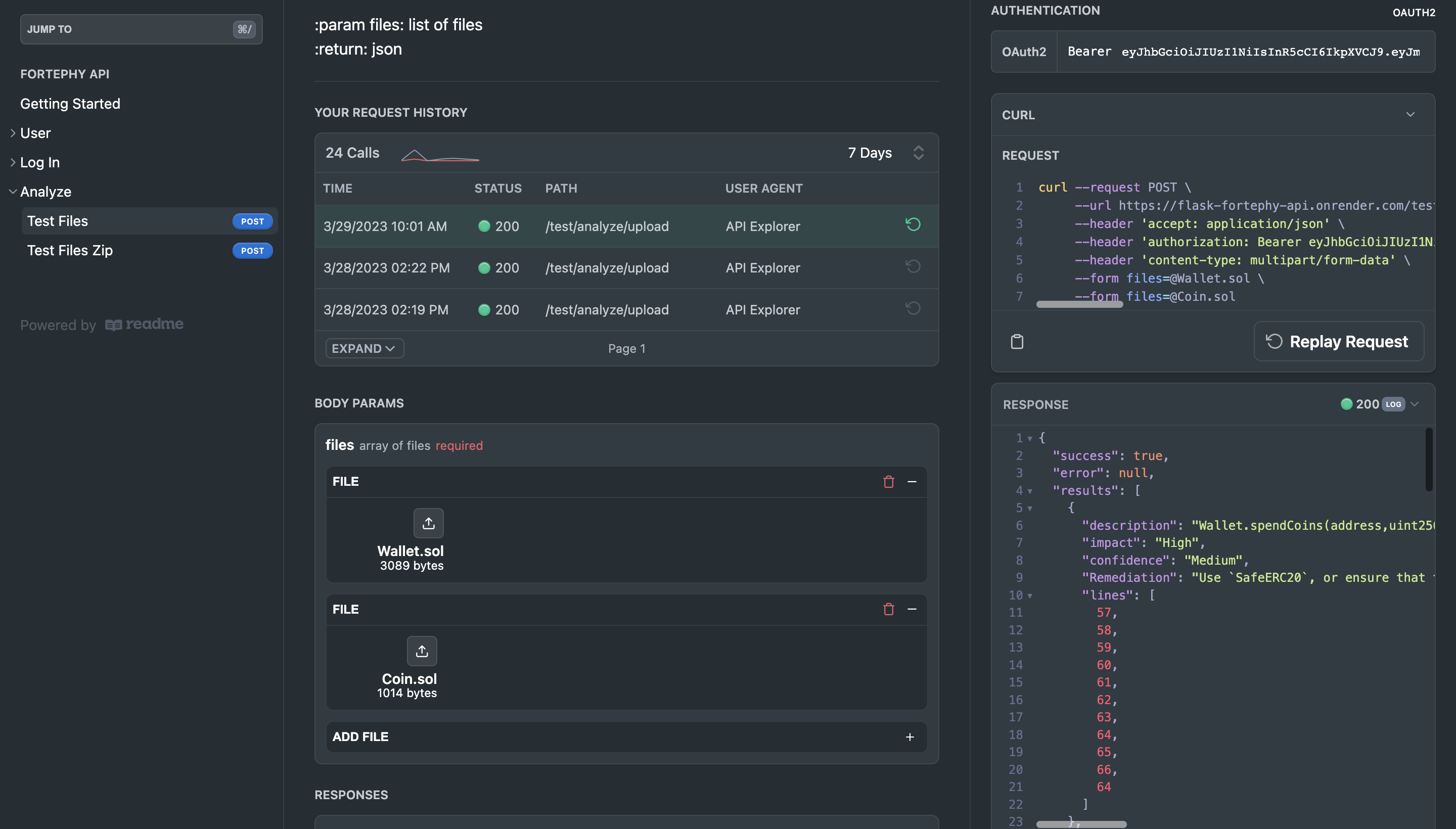- Select the Analyze endpoint, here you have two options, using the "Test Files" endpoint where you can upload individual smart contracts.